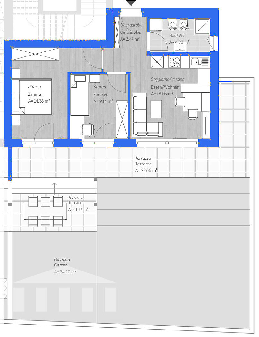 Zum Verkauf steht diese moderne Neubauwohnung in Eppan/St. Pauls. Auf 49 m²Nettowohnfläche bietet sie zwei Schlafzimmer, ein elegantes Badezimmer und einen offenen Wohn-/Küchenbereich. Die Wohnung im Erdgeschoss verfügt über eine sonnige Terrasse mit direktem Zugang und einen Privaten Garten; ein Aufzug gewährleistet bequemen Zugang zur Garage. Hochwertige Ausstattung, helle Räume und ein durchdachter Grundriss machen sie ideal für Paare oder als Anlageobjekt.